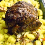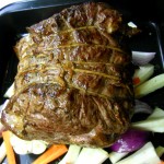 Pentru a servi, scoti bucata de carne pe o tava si o lasi sa se odihneasca, acoperita cu folie de aluminiu, cam 20 minute.  Tai carnea in felii subtiri si frumoase si servesti cu cartofii si legumele din tava (usturoiul ala intreg si copt, care a stat sub carne, e cel mai bun, va spun eu).