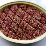 Unge cu foarte putin ulei o forma termorezistenta.  Pune tocatura in aceasta forma.  Cu un cutit, ‘taie’ tocatura in romburi.  Aseaza in mijlocul fiecarui romb o boaba de piper negru. (Marturisesc sincer ca am fost foarte tentata sa mananc tocatura asta cruda si nu pot garanta ca data urmatoare nu voi trece la fapte 🙂