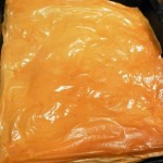 ca 250g foi de placinta (vreo 12 bucati), taiate pe forma tavii – dupa ce le-ai scos din frigider, acopera foile cu o carpa de bucatarie umeda, ca sa nu se usuce pana cand termini de asamblat placinta