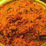 Amesteca pasta de rosii cu pasta de ardei iuti intr-un castron, adauga bulgurul scurs si amesteca bine.  Lasa vreo 10 – 15 minute.  Rasfira bulgurul cu furculita, apoi adauga-i piperul negru, cuminul, menta uscata, uleiul, siropul de rodie, ceapa rosie si sucul de lamaie.  Gusta si vezi daca mai trebuie lamaie – trebuie sa fie destul de acrisor.