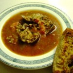 Pai, cum vine asta: chiftelute de crevete cu sos de iaurt cu sofran, tahini si miere, calamar umplut in 2 feluri SI stiuca umpluta? Va dati seama? Ca sa nu ma dau complet de rusine, a trebuit sa improvizez ceva competitiv. Asa ca am incercat o versiune simplificata de bouillabaise. Simplificata din cauza lipsei unor ingrediente importante (pestii de Mediterana care figureaza in reteta originala), dar si din cauza ca un sos rouille adevarat mi se parea prea mult pentru festinul nostru.