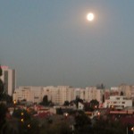 Ieri a fost luna plina – rotunda ca o oala mare, cu ciorba dreasa cu smantana.  Cel putin asa mi s-a parut mie, care ma aflam in plin proces de productie.  Am reusit sa ii trag cateva poze de pe terasa si m-am intors la ale mele.