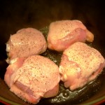 Intr-o cratita, pune la incins uleiul.  Adauga pulpele de pui, asezoneaza cu sare si piper si rumeneste frumos, cateva minute pe fiecare parte.  Nu inghesui bucatile de pui – e de preferat sa faci operatiunea asta in mai multe transe.  Cand sunt aurii, scoate-le din cratita si da-le deoparte.
