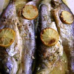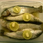 Umple pastravii cu compozitia de mai sus. Aseaza-i in forma unsa cu unt, asezoneaza-i cu sare si piper. Pe fiecare pastrav, pune o felie de lamaie si o bucatica de unt. Stropeste cu vin alb si da la cuptor pentru 30 – 40 de minute, ungandu-i din cand in cand cu sosul din tava. In ultimele 10 minute, poti trece cuptorul pe grill, pentru ca pestii sa se ‘bronzeze’ frumos. Daca nu ai rabdare pana la reteta de linte de maine, merg si niste cartofi natur plus o salata verde.