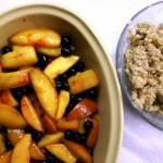 – in loc de mere, am folosit 4 piersici taiate in felii si un pumn zdravan de afine. Piersicile le-am calit intr-o cratita, cu 2 linguri de zahar brun si 1 lingura de otet balsamic. In ultimele cateva minute, am adaugat si afinele.