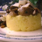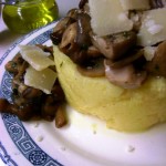 Etapa finala e cea mai importanta, pentru ca da mai tot fasonul operatiunii. Daca ai un inel metalic pentru servit, il ungi pe dinauntru cu putin ulei, sa nu se lipeasca mamaliga. Asezi inelul pe farfurie si pui inauntrul lui un strat consistent de mamaliga. Deasupra, asezi un alt strat, de ciuperci. In absenta inelului, potrivesti frumos, cu lingura, mamaliga si deasupra ei ciupercile. Picuri nitel ulei cu trufe albe – aroma absolut speciala va lega intreaga reteta, cu notele sale usor picante, inconfundabile. Peste tot si toate, cateva felioare de parmezan ras. Si, sa nu uit, un pahar de vin rosu italienesc. Buon appetito!