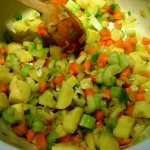 Acum, pune in oala telina, morcovul, cartoful si jumatate din usturoi, amesteca bine si lasa sa se caleasca si ele 1 – 2 minute.