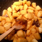 Intr-o tigaie, pune la topit untul. Adauga zaharul si lasa sa se caramelizeze frumos, pana devine auriu. Acum e randul bucatilor de mere si al aromelor – amesteca totul bine si lasa pe foc cateva minute, pana cand merele se inmoaie, fara a se zdrobi. Ia de pe foc si lasa sa se racoreasca.