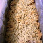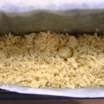 Pregateste o forma de chec/cozonac – tapeteaza-i fundul si laturile mari cu hartie de copt. Unge hartia si capetele formei neacoperite cu putin unt. Da pe razatoarea mare jumatate din aluatul de tarta. Presara-l pe fundul formei in strat uniform.