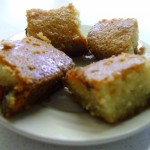 Buuuun. Vin ei musafirii, ajungem la desert, ma scuz eu in toate felurile ca e cam anemica prajitura, c-o fi, c-o pati. Musafirii, politicosi, ce sa zica? Bucurosi le–om duce toate … Iau ei de politete cate o bucatica. Nici nu o inghit bine pe aia, ca mai intind mana dupa inca una. Ia uite ce ma iubesc prietenii, imi zic eu, cum se straduie dragutii de ei. Cand au ajuns la a treia bucata, treaba a devenit suspecta, asa ca am intins si eu manutza sa incerc o firimitura. Nene, mai sa-mi dea peste mana si alta nu! Bine c-am incercat, ca altfel nu aflam cat de bun a fost ravani-ul asta. Mic, mic da’ parfumos, siropos si untos de se topea in gura. Saru-mana, kiria E., si petrecere frumoasa cu lautarii!
