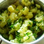 Intr-o oala potrivita, pune cartofii cuburi si acopera-i cu apa rece.  Sareaza usor si da la fiert.  Cand sunt gata, scurge-i intr-o strecuratoare si intoarce-i in oala.  Imprastie peste cartofii fierbinti untul taiat bucatele si patrunjelul verde tocat.  Potriveste de sare.  Acopera oala cu un capac si scutur-o zdravan de cateva ori. Gata!