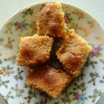 Cam astea ar fi toate numele pe care le-am gasit pentru prajitura asta facuta cu gris si insiropata nevoie mare.  Cine a fost prin Grecia nu a putut sa o rateze – e un dulce atat de parfumat si de intens, incat te satura de desert pentru – hai sa fiu atenta ce scriu aici – cam 24 de ore, dupa recordul meu personal de 8 bucati infulecate fara pauza de respiratie.   Variantele de reteta sunt cel putin tot atatea ca si numele.  In aluat, unii pun nuca de cocos rasa, altii migdale.  In sirop, apa de trandafiri, apa de portocale sau scortisoara.  Am gasit chiar si varianta acoperita cu frisca si felii de fruncte, insa pana si eu sunt de acord ca asta e o tzara over the top.