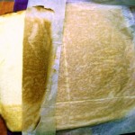 Odata omogena, toarna compozitia pe tava cuptorului tapetata cu hartie de copt.  Da la copt pentru 6 minute, sa se umfle si sa se rumeneasca usurel.  Scoate din cuptor, rastoarna blatul pe o carpa curata de bucatarie.  Desprinde usurel foaia de copt de pe blat si acopera-l cu o alta carpa de bucatarie, foarte usor umezita.  Lasa-l asa pana cand s-a racorit complet.