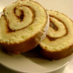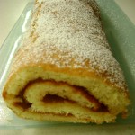 In fereastra imi bate o raza de soare si ma simt precum griveiul toparcean – usor iritabila, nerabdatoare.  Am chef de ceva dulce – asta nu e nimic nou.  Am chef de ceva dulce SI usor, dar nu prea dulce, ba chiar un pic acrisor.  Foarte hotarata fiinta mai sunt si eu!  Asa ca fac o rulada aeriana si pufoasa, umpluta cu ceea ce am la indemana.  Ar fi putut sa fie un gem de caise ori de zmeura; n-ar fi dat rau nici o crema buna de cioco.  Insa cel mai simplu a fost sa mai desfac un borcan de apple butter si sa termin rapid cu toata constructia cea zaharicoasa.