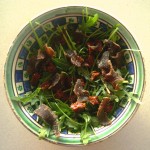 Nu prea am ce povesti despre reteta – se amesteca toate cele de mai sus intr-un castron si se mananca cu felii de paine taraneasca proaspata.  Daca faceti rost de niste biltong, veti intelege despre ce vorbesc.  Gustul sarat-dulceag al carnii s-a potrivit de minute cu otetul balsamic si cu rosiile uscate.