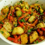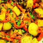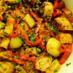 Pune cartofii copti intr-un castron si lasa-i sa se racoreasca. Amesteca-i cu caperele, maslinele, patrunjelul si ardeii copti.