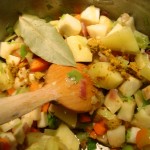 Caleste in ulei, la foc potrivit, ceapa si apoi usturoiul, cateva minute.  Adauga morcovii, cartoful si telina cuburi, precum si frunza de dafin si amesteca.  Lasa inca 2- 3 minute pe foc, apoi toarna deasupra supa de legume.