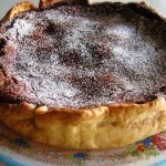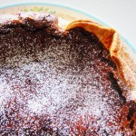 Pune in cuptorul incins pentru circa 30 de minute – umplutura se va umfla usor, ca la un sufleu.  Scoate din cuptor, lasa sa se raceasca, ridica din forma, indeparteaza hartia de copt si pudreaza cu cacao si/sau zahar pudra.  Hmm, n-ar fi rea nici ceva frisca batuta, asezata ca un nor, deasupra…Alaturi de o cafea buna, e visul oricarui chocoholic!