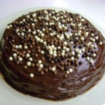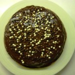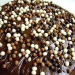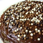 Din motive de sevraj si lene, eu am acoperit tortul cu toata crema si gata. Am presarat bilutele de ciocolata si am pus la frigider, sub paza stricta (adica amenintari fatise cu tortura fizica si psihica pentru oricine s-ar fi aventurat sa se atinga de el). Ce sa va spun despre momentul cand am luat prima lingurita din acest tort? Crema se intarise, era densa si uber-ciocolatische, bilutele de deasupra erau crunchy, miezul era pufos si parfumat, iar stafidele … dom’ne, eram in Rai!