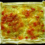 Scoate tava incinsa din cuptor si – cu mare grija, sa nu te arzi – aseaza tarta pe tava.  Da la cuptor pentru 5 minute.