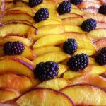 Scoate din cuptor, aseaza frumos feliile de piersica pe tarta si unge cu untul topit care ti-a mai ramas.  Da din nou la cuptor 10 minute.